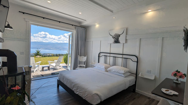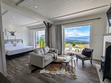 Premium guest suite with a modern farmhouse flair. Panoramic lake views! Luxury ensuite, king bed, 2 private patios, living area & equipped kitchenette.
